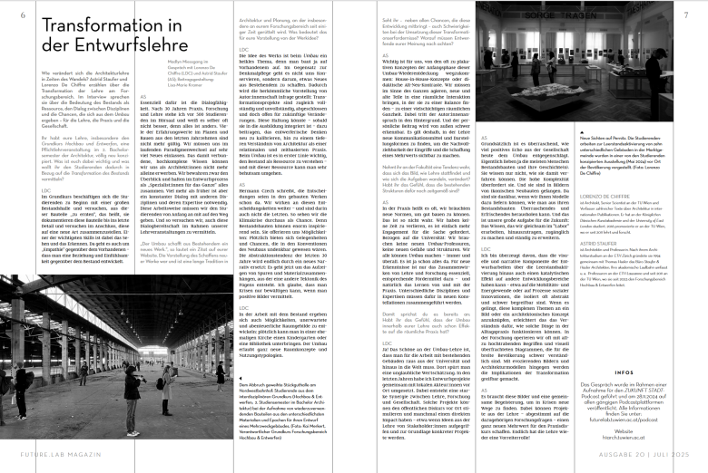 Die future.lab Magazin Ausgabe #20 zieht eine Zwischenbilanz. Denn die Auseinandersetzung mit dem Bestand ist kein abgeschlossenes Kapitel, sondern hat sich mehr und mehr zum neuen Normal entwickelt, auch und gerade in der universitären Lehre. Was ist seit Beginn des Jahresthemas entstanden? Welche Impulse wurden gesetzt? Und vor allem: Auf welche Weise findet die Transformation des Bestands Eingang in Lehre und Ausbildung?